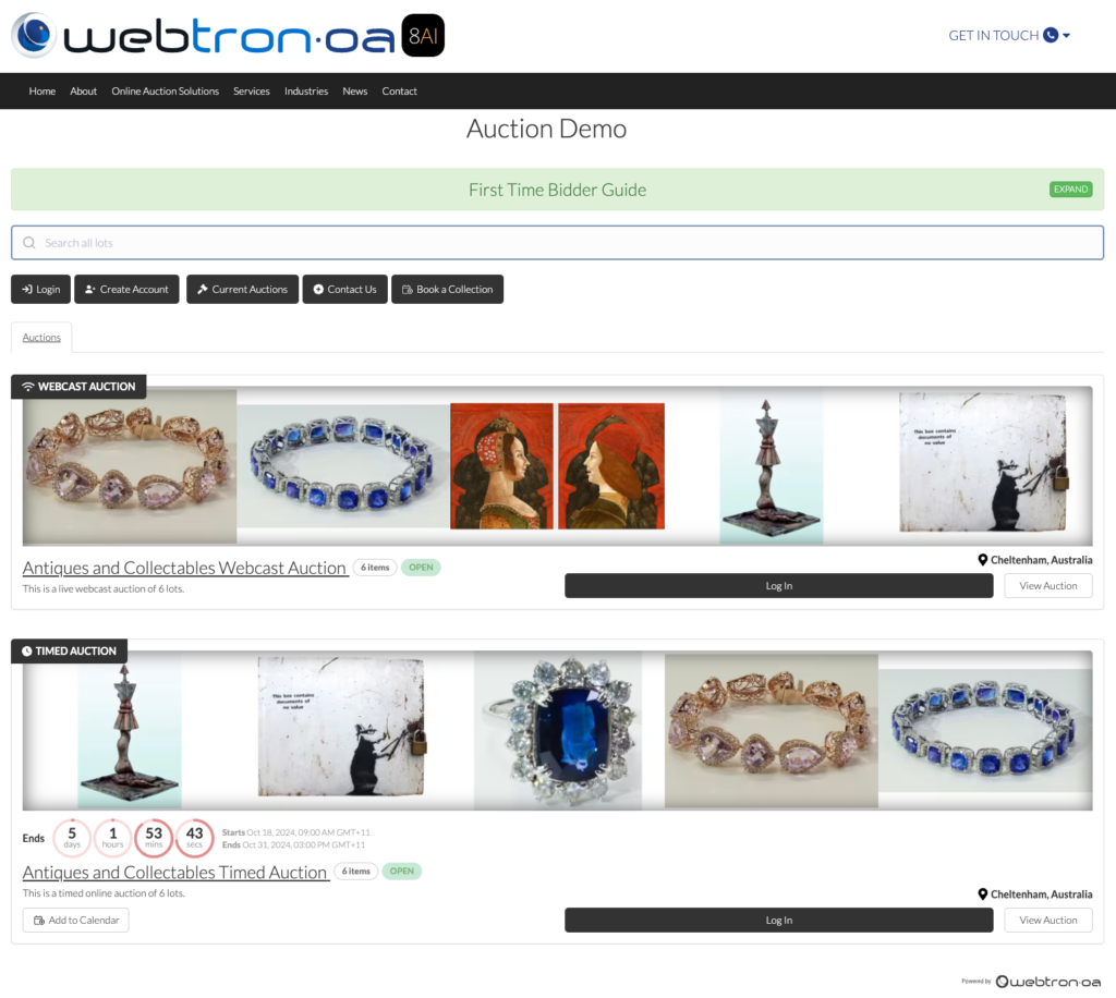 Definition – The Webtron Auction Portal is the Online Bidding Portal placed on your Website, it is the front-facing Interface your Bidders use to view your Auctions, Auction Item Catalogues, Create an Account, and Browse, Bid on, or Watch your Auctions. When the Portal is placed on your website, we refer to it as “Your Business Name’s Portal”. If you have any questions about your Portal regarding Branding, Colours or Functionalities, feel free to email us at support@webtronoa.com.