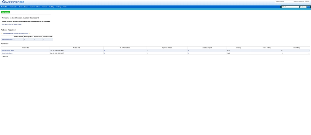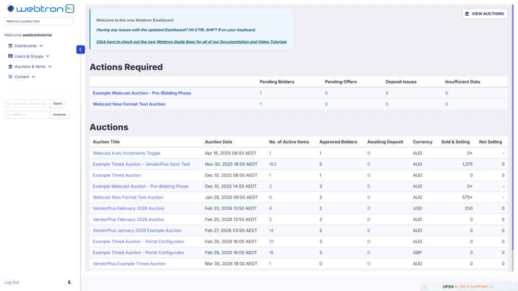 Definition – The Webtron Auction Management Dashboard, or Webtron Dashboard for short, is the dashboard Webtron provides that allows you to Create new Auctions and Items, Manage your Auctions and All Bidding Activity, Manage your Users/Bidders and Clerk your Live Webcast Auctions. Click here to open our Introduction to the Webtron Dashboard guide list.