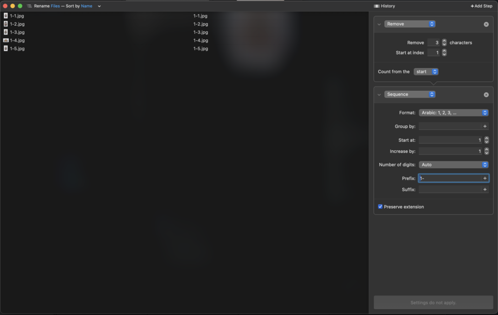 Name Mangler will apply your changes to the files where they are, it won’t copy or duplicate the files you’ve chosen. If you are seeing the “Settings do not apply.” warning, it is because there are files that already match the Preview name of your files in their folder. Name Mangler won’t replace existing files and cannot change file names if there are already files in that folder that match the new name you’re trying to set.