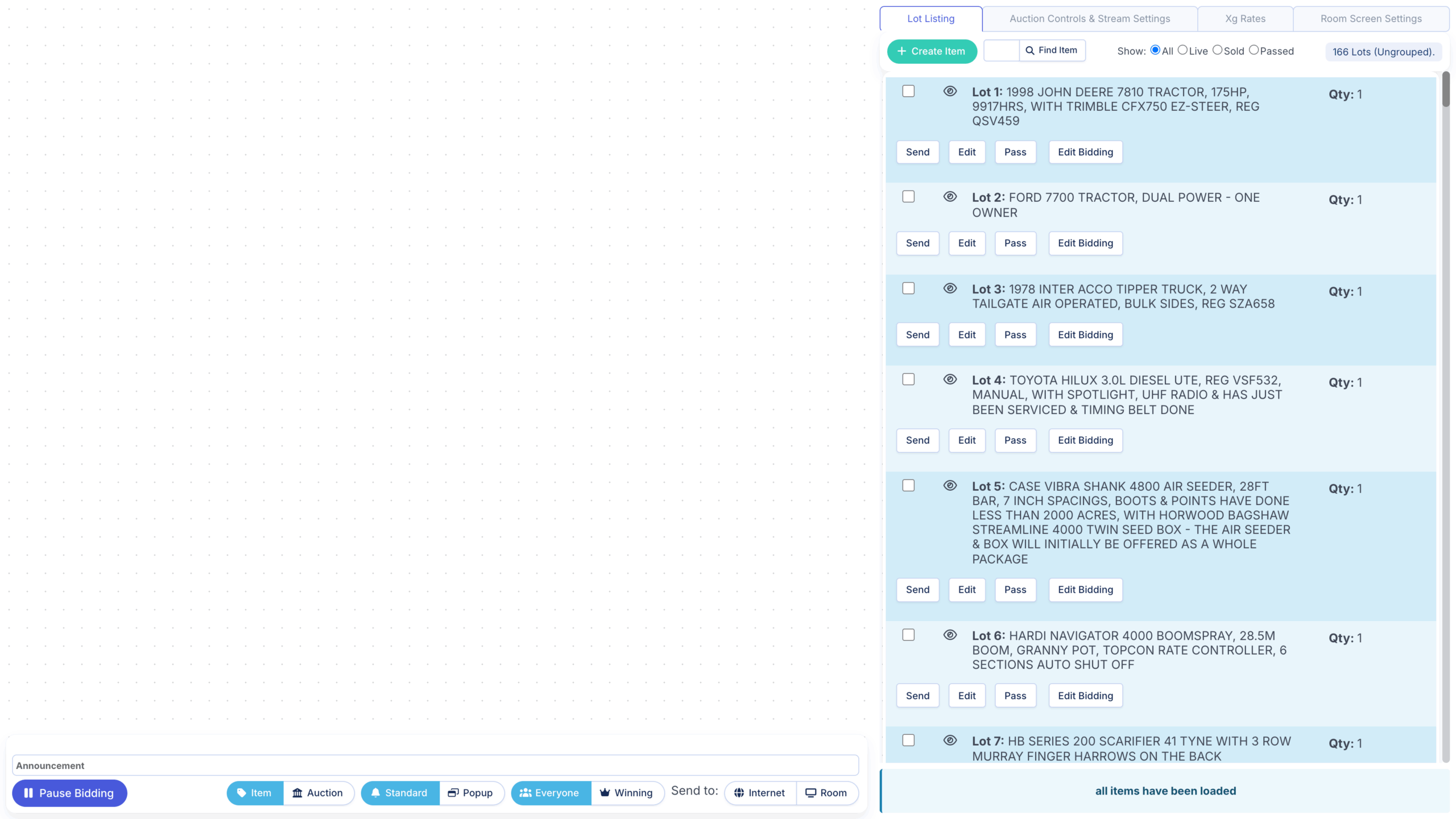 Once your Auction is in the Live Bidding phase and the Auctioneer has given you the nod, you can send your first Lot into the Ring by opening the Lot Listing tab, then click the Send button on any Lot (most Auctioneers will start on Lot 1 but you can send any Lot into the Ring):